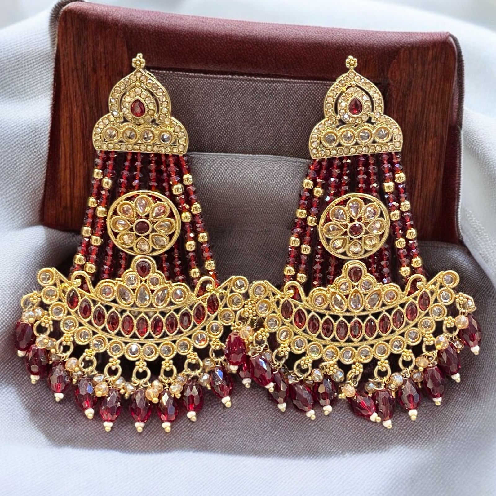 Designed with a large circular centerpiece adorned with intricate patterns, each piece is surrounded by delicate hanging beads that create graceful movement. Despite their bold appearance, these pieces are lightweight, ensuring a comfortable fit for long hours of wear.